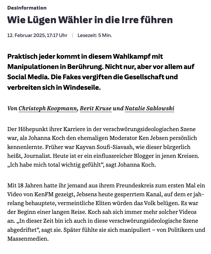Im Artikel vom 12. Februar 2024 von Natalie Sablowski, Berit Kruse und Christoph Koopmann durfte ich meine Perspektive einbringen. Der Beitrag ist online hier abrufbar: Süddeutsche Zeitung.